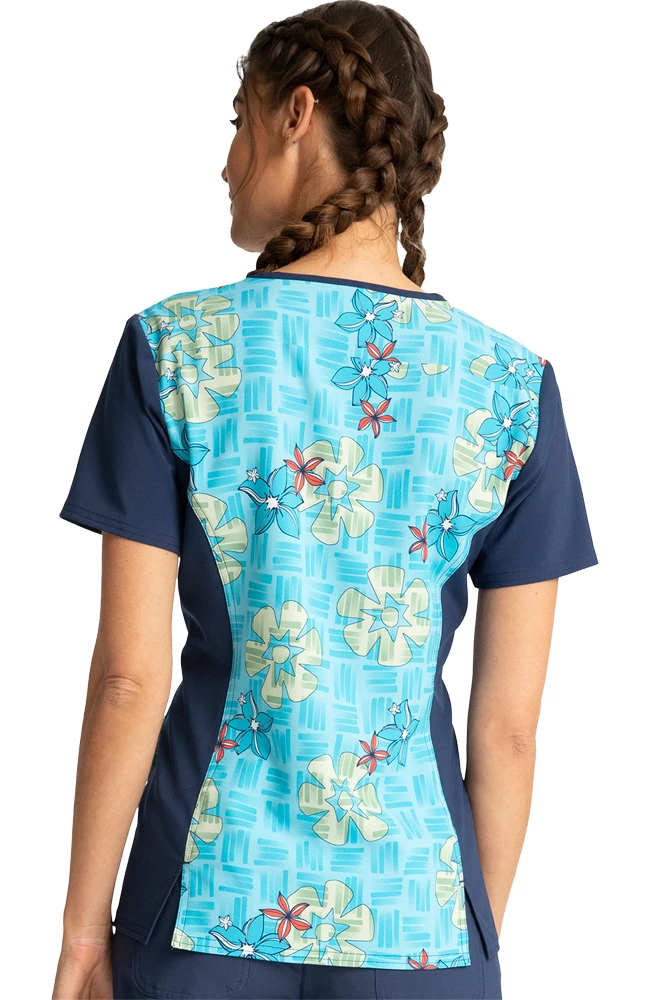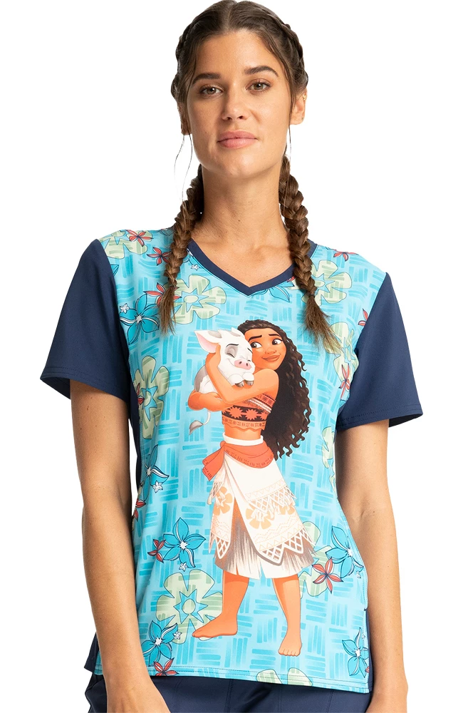 Set off on an adventure in the Tooniforms by Cherokee Women’s Moana Energy Print Scrub Top. The enchanting digital print features Moana and Pua on a tropical floral backdrop.
