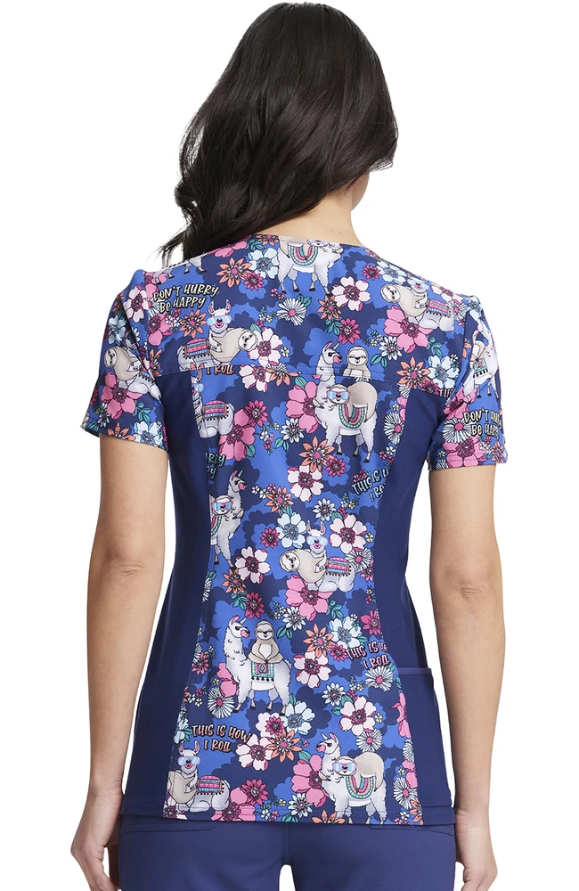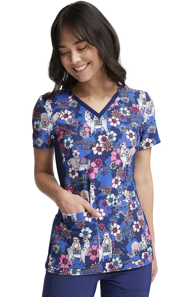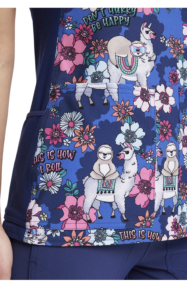 Feel the positive vibes in the iflex by Cherokee Women’s Happy Pals Print Scrub Top. Stretchy knit side panels add extra comfort and movement, while several front pockets add the utility you need.