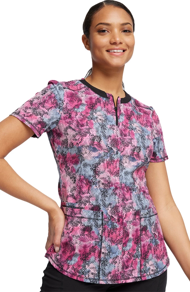 You’ll love the edgy yet feminine design of the Infinity by Cherokee Women’s Hiss Or Miss Print Scrub Top. The ribbed neckline features a partial zip closure for a fashion-forward twist.