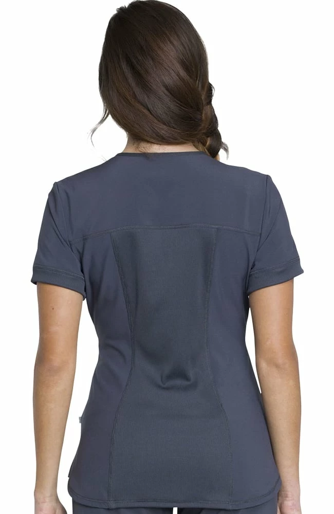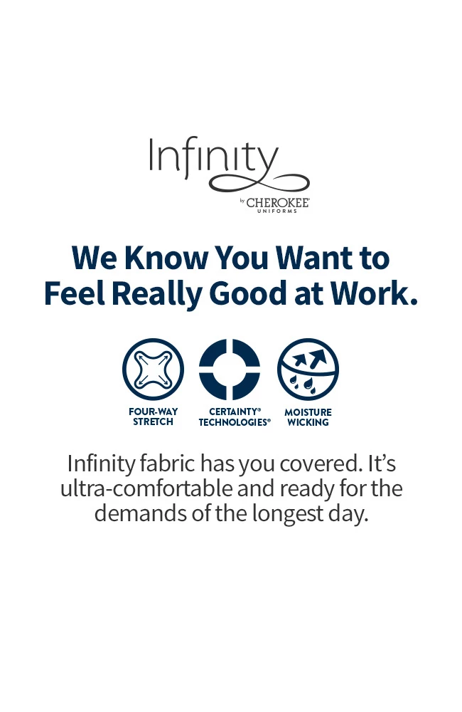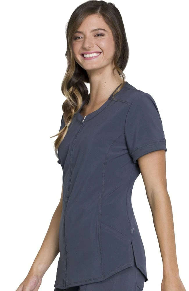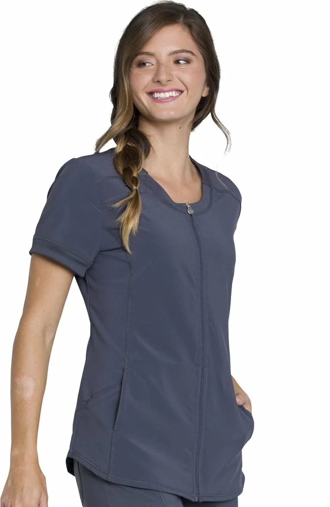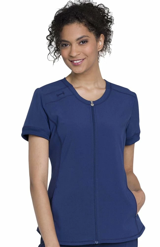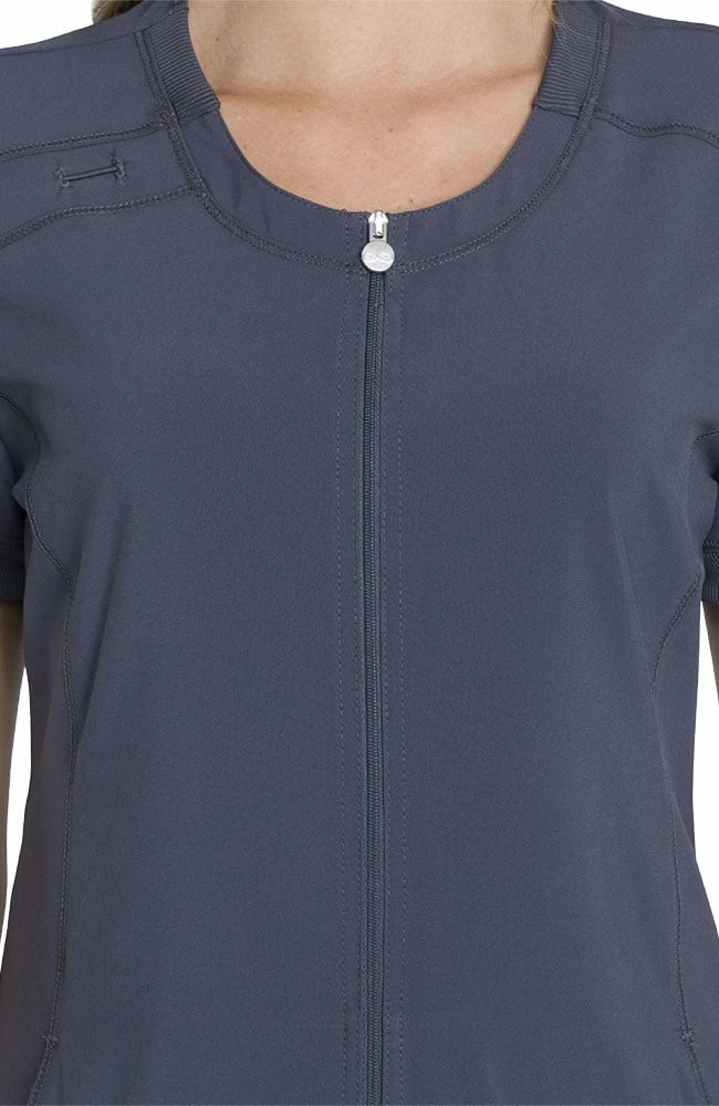Update your uniform with this Infinity by Cherokee Women’s Zip Front Round Neck Solid Scrub Top. The modern exposed zip styling adds a subtle edge.