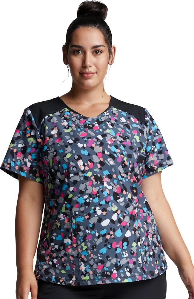 Spread joy and positivity in the Dynamix by Dickies Women’s Confetti Pop Print Scrub Top. This colorful scrub top has two roomy patch pockets, plus contrast panels for added style.
