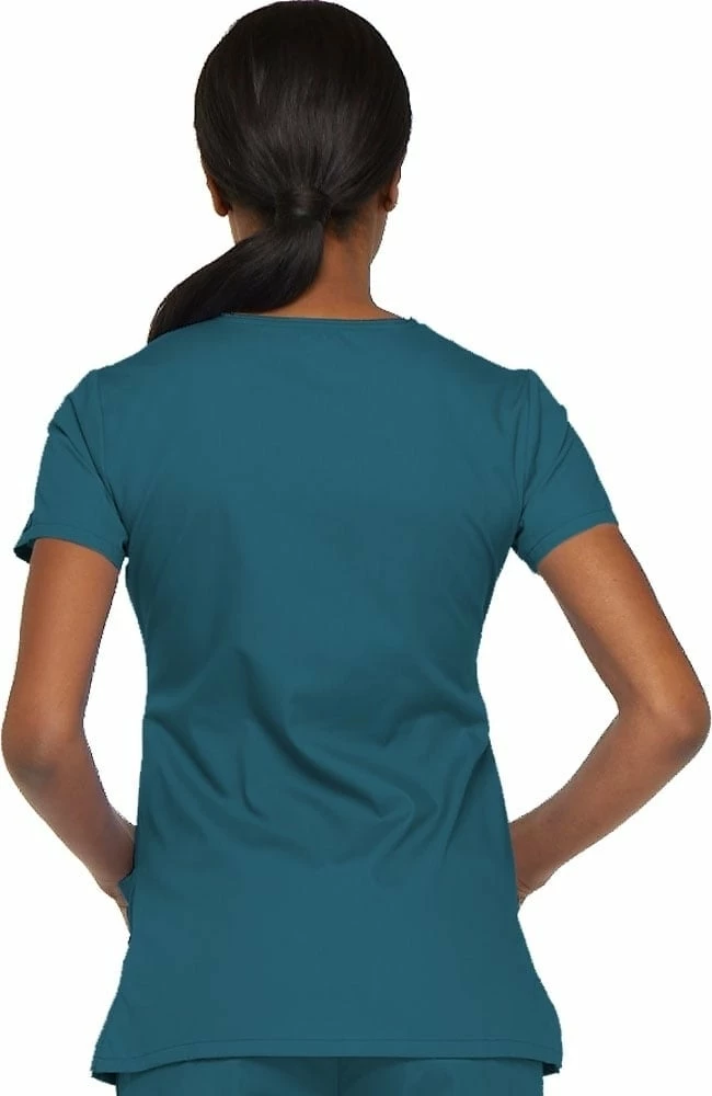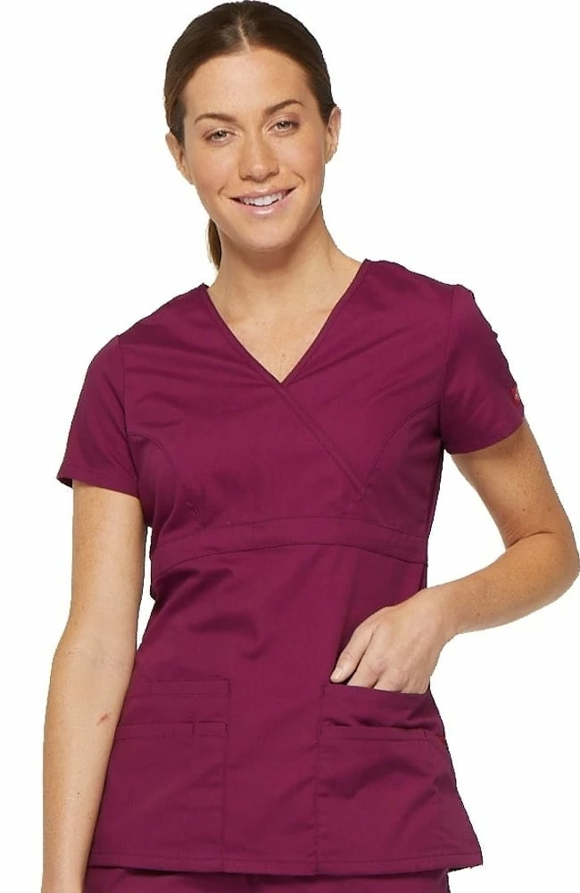 This mock wrap scrub top from Dickies EDS Signature collection is a delightful basic. There are front patch pockets, layered with additional sectional pockets. There’s an instrument loop on the left pocket. Princess seams and side vents make the shape flattering and comfortable. Brushed poly/cotton blend.