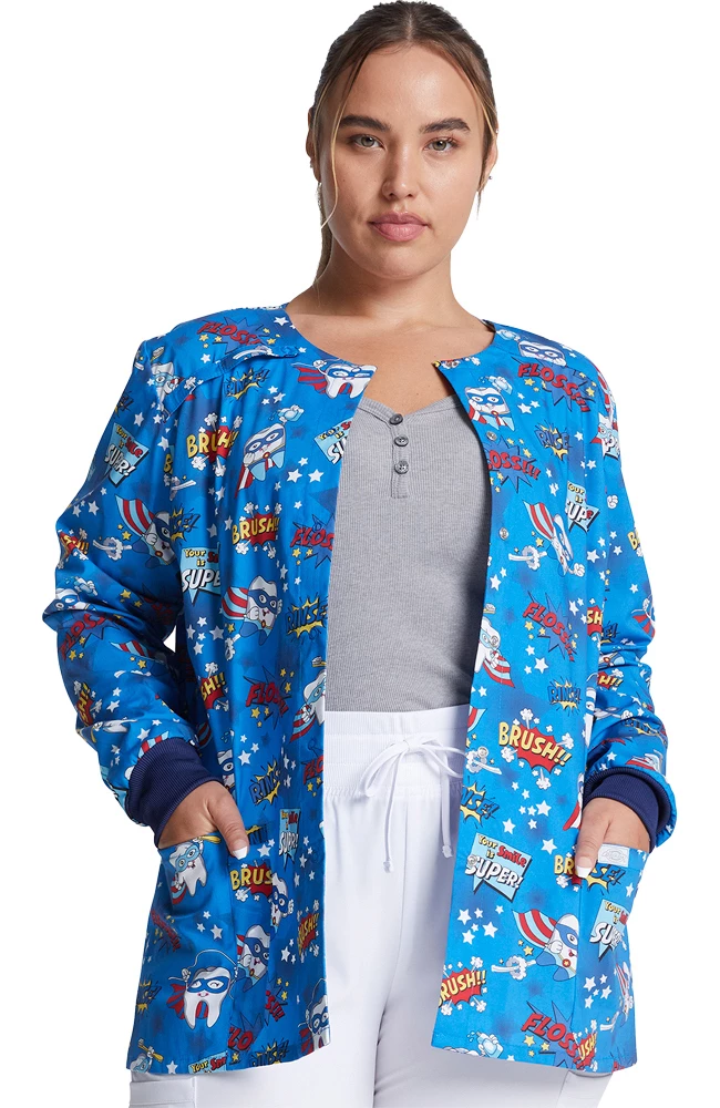 Encourage healthy habits when you wear the EDS Essentials by Dickies Women’s Snap Front Super Smile Print Warm-Up Jacket. This toothy superhero warm-up jacket is perfect for dental offices.