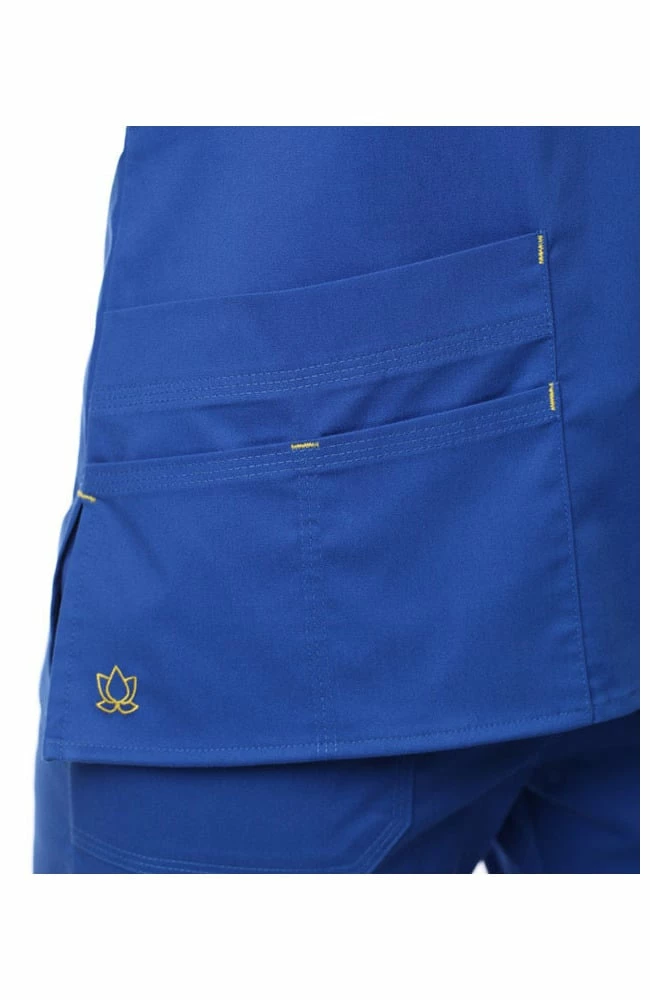 You’ll feel like a princess in the 1102 mock-wrap scrub top from Maevn’s Blossom collection with princess seaming for a flattering fit. This scrub top features two front patch pockets, the right front pocket is layered with a split utility pocket that provides a handy place to store your tools and your smart phone. The left front pocket conceals a three-part twill tape accessory loop. This scrub top is triple stitched at the shoulders and pockets for a smooth finish and for durability. There is also contrast bartacking at all pressure points. The fabric is a comfortable and super-soft cotton, polyester and spandex blend that is brushed inside and out.