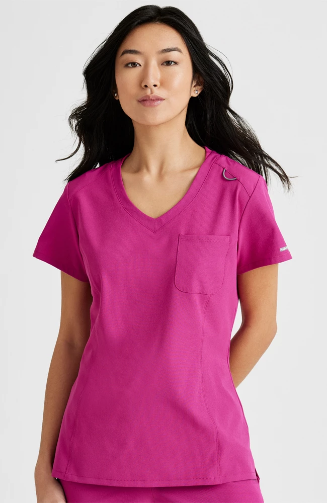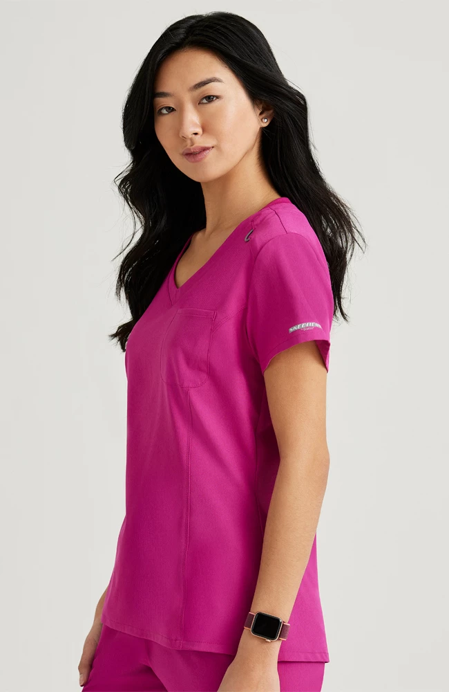Keep it simple and straightforward in the ultra-comfortable and versatile Skechers Women’s V-Neck Tuck-In Scrub Top. The one-pocket design combined with a high-low hem gives you an effortless tucked-in style, and looks just as good when you want to wear it untucked, too.