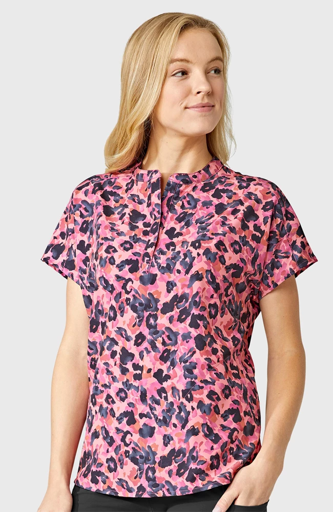 Fashionable, functional, and flattering all at once, the WonderWink Women’s Mandarin Collar Amala Print Scrub Top easily elevates your professional uniform. It has rounded dolman sleeves, an elegant mandarin collar that adds coverage, and side vents at the hemline for extra movement.
